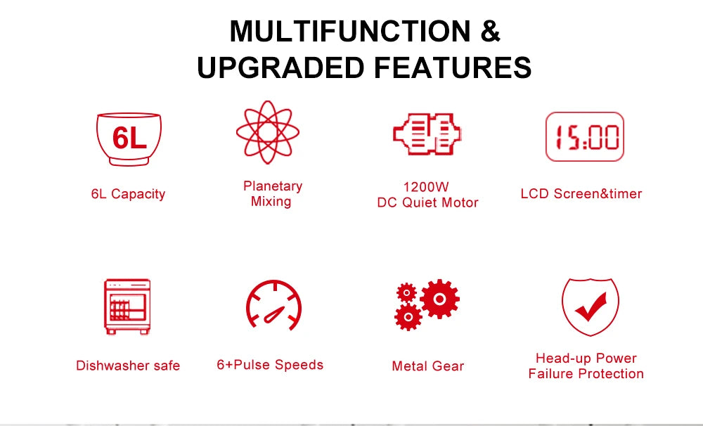 【6L Large Capacity】 BioloMix is equipped with a 6L food-grade stainless steel bowl with dual handles which are more convenient to hold. which can efficiently accommodate family gatherings of 8-10 people. With all metal hardened wire whisk and oversized Teflon coating dough hook, flat beater . Dishwasher safe.